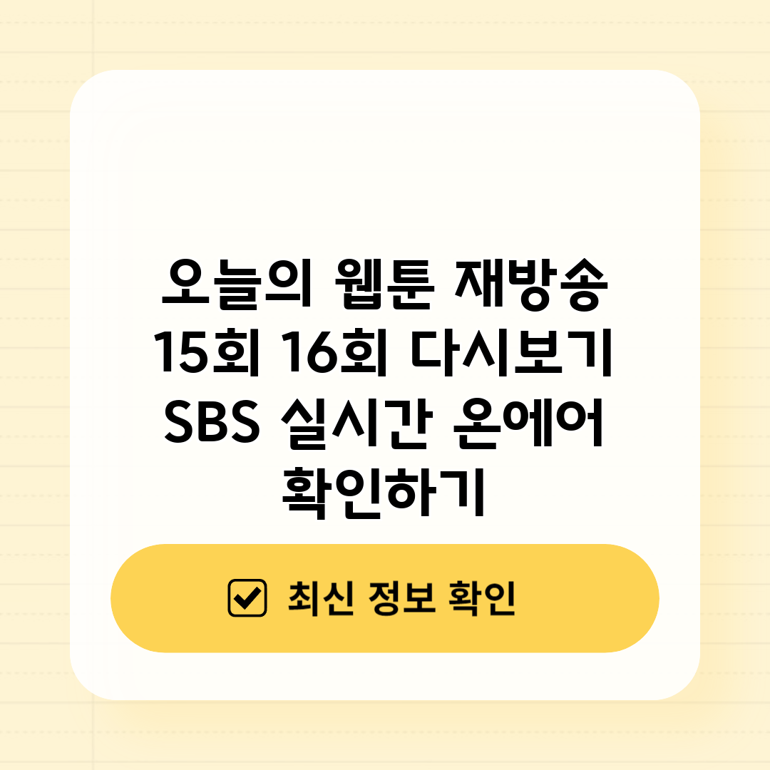 드라마 오늘의 웹툰을 보고 나면, 그 감동을 잊지 못하게 되죠. 그런데, 놓친 회차가 있다면 어떡하죠? 걱정 마세요! 15회와 16회를 재방송으로 다시 시청할 수 있는 방법을 함께 알아보겠습니다.