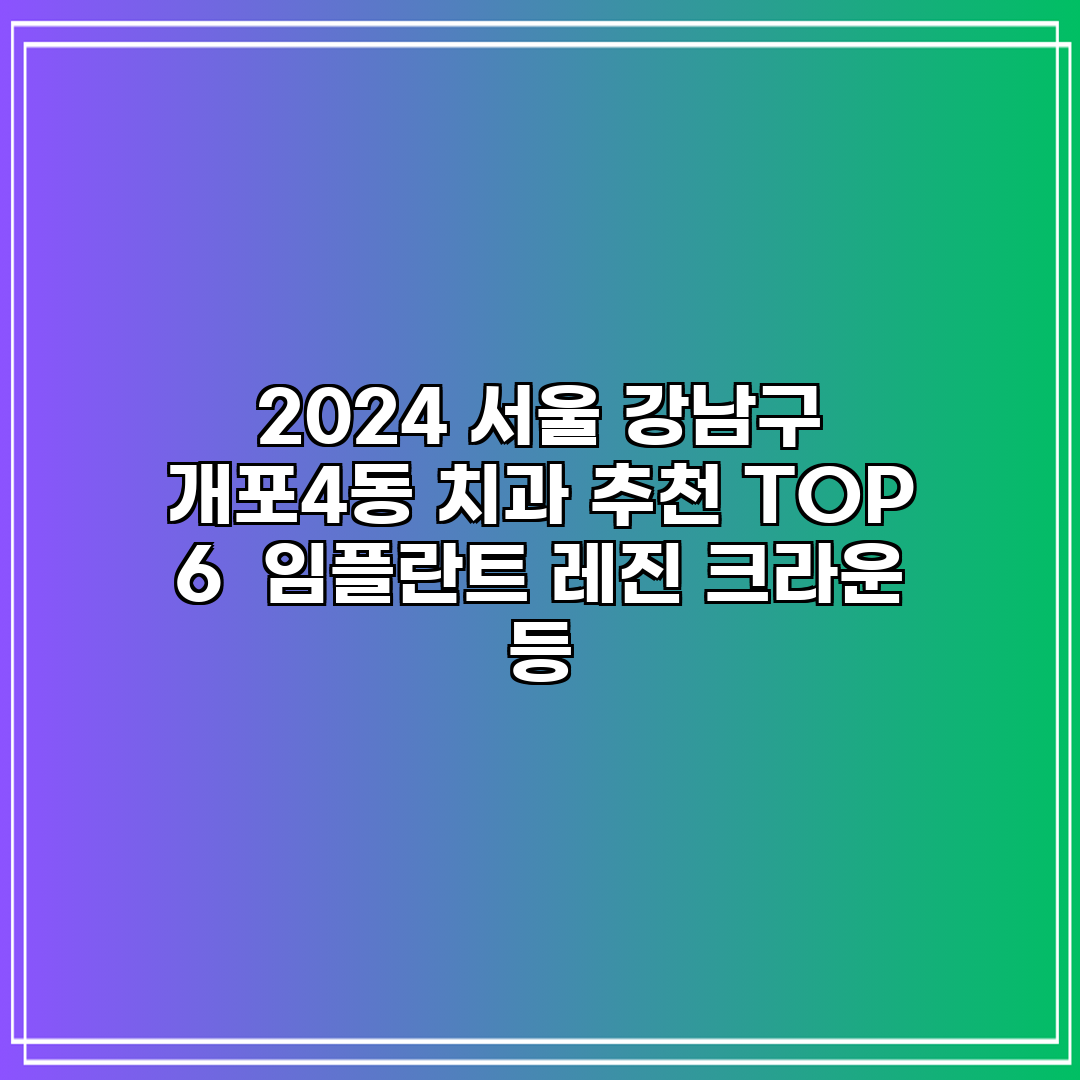 A: 2024년 서울 강남구 개포4동에서 추천하는 치과로는 ‘이상치과’, ‘강남페이스치과’, ‘개의원치과’, ‘힘찬치과’, ‘서울나눔치과’, ‘미소치과’ 등이 있습니다. 이들은 뛰어난 의료진과 최신 장비를 갖추고 있어 임플란트와 레진 크라운 시술에 추천됩니다.