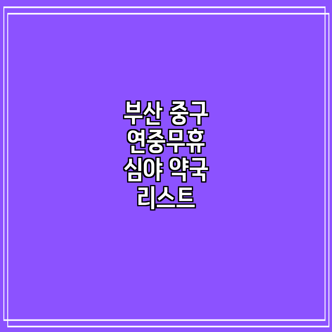 부산 중구에 있는 연중무휴 및 심야 운영약국 리스트를 통해, 미리 주소와 전화번호를 확인해보세요. 이 정보는 급한 상황에서도 빠르게 적절한 도움을 받을 수 있게 해줍니다. 아래는 유용한 약국 리스트입니다: